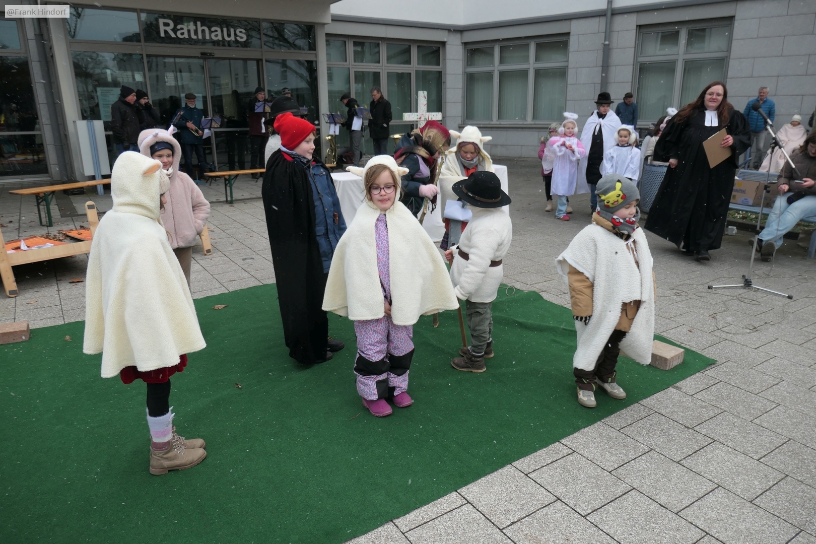 Dies alles spielt sich auf dem Marktplatz in Sinzheim an Heilig Abend ab. Diakonin Miriam Schönle von der Matthäusgemeinde hat zum Krippenspiel eingeladen. Viele waren ihrer Einladung trotz des kalten Wetters gefolgt. Mit Punsch oder Glühwein konnte man sich innerlich aufwärmen.