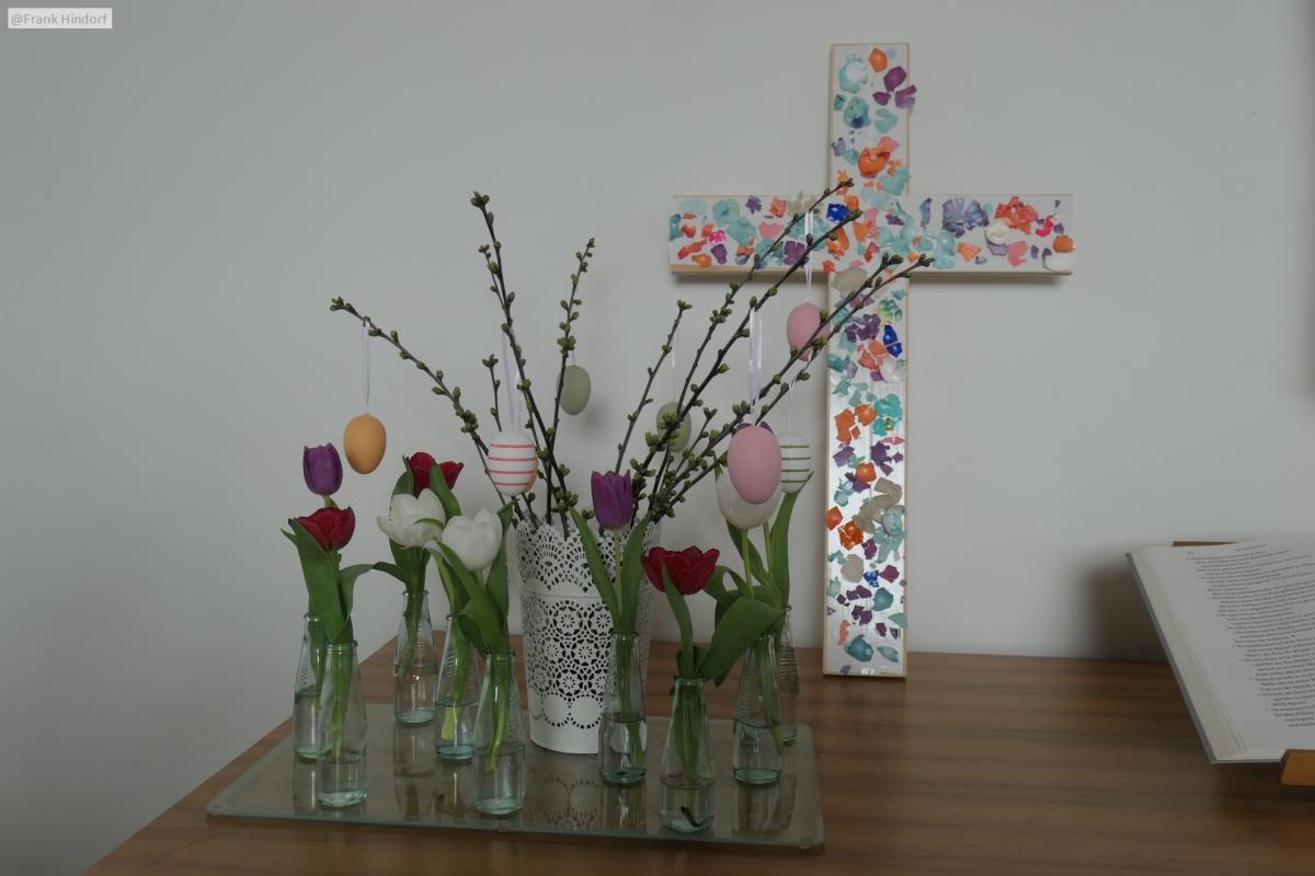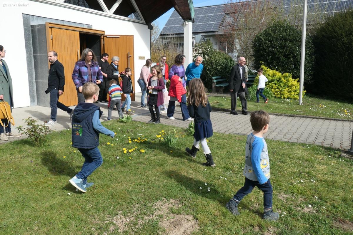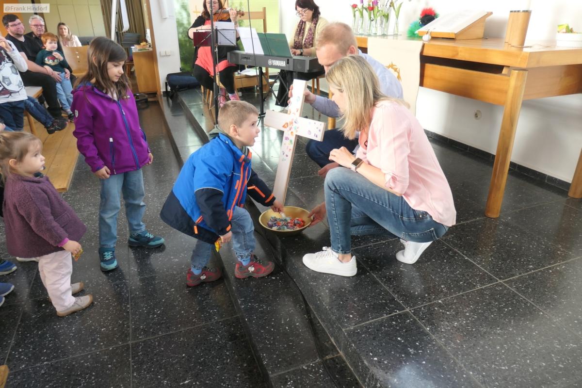 Das Team der Familienkirche und Leitung von Diakonin Miriam Schönle hat uns zu einem fröhlichen Familien-Ostergottesdienst in die Matthäuskirche nach Steinbach eingeladen. Die Kirche war voll und es ging mit den vielen Kindern sehr lebhaft zu. Anhand von Bildern wurde die Ostergeschichte erzählt. Der Papagei hatte viele Fragen, die er von Jürgen Knöbl beantwortet habe wollte, besonders, was es mit den Ostereiern auf sich hatte. Ihm wurden alle Fragen zufriedenstellend beantwortet. Die ganze Gemeinde wurde aufgefordert ein weißes Kreuz mit bunten Eierschalen zu bekleben. Am Ende entstand buntes, fröhliches Kreuz, das ein schönes Symbol für die Auferstehung ist. Nach dem Gottesdienst stürmten die Kinder nach draußen in den Garten, um nach den versprochenen Schokoeiern zu suchen. Es gab noch Kirchkaffee und die Kinder konnten Osteranhänger bemalen.